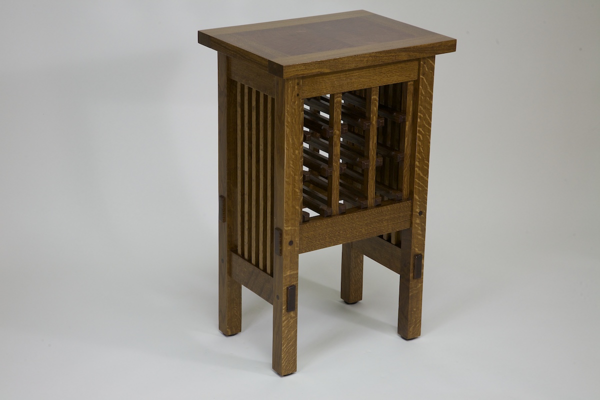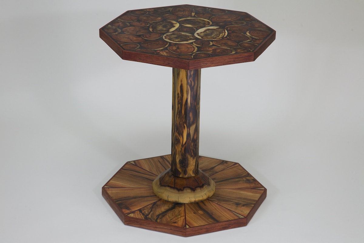 The ones that sparked the most conversation tended to have subtle details that made us question how they were inspired, planned, jigged and executed. Like the pierced carvings in Robert Zicafoose’s replica bistro table. In today’s age it wouldn’t be uncommon to hear they were carved with a computer controlled router and zipped out faster than he could get through a cup of coffee. But no, he carved each one by hand, and each leg consumed about a week of his time. That’s the story with the tables in this collection; they were crafted by individuals who enjoy the satisfaction of taking on these challenges and hard work. Check out the fluted turned legs on Richard Fackrell’s table. The painstakingly finished wine rack table by Joe Gross. The “chocolate dipped” splayed legs of Bill Brickey’s side table. The mind-blowing puzzle pieces in Jill Walterbach’s table. The tapered and bent laminated legs on John Bowers’ table. The inlays on Harland Thompkins’, Carey Reed’s, and Rick Switzer’s tables.