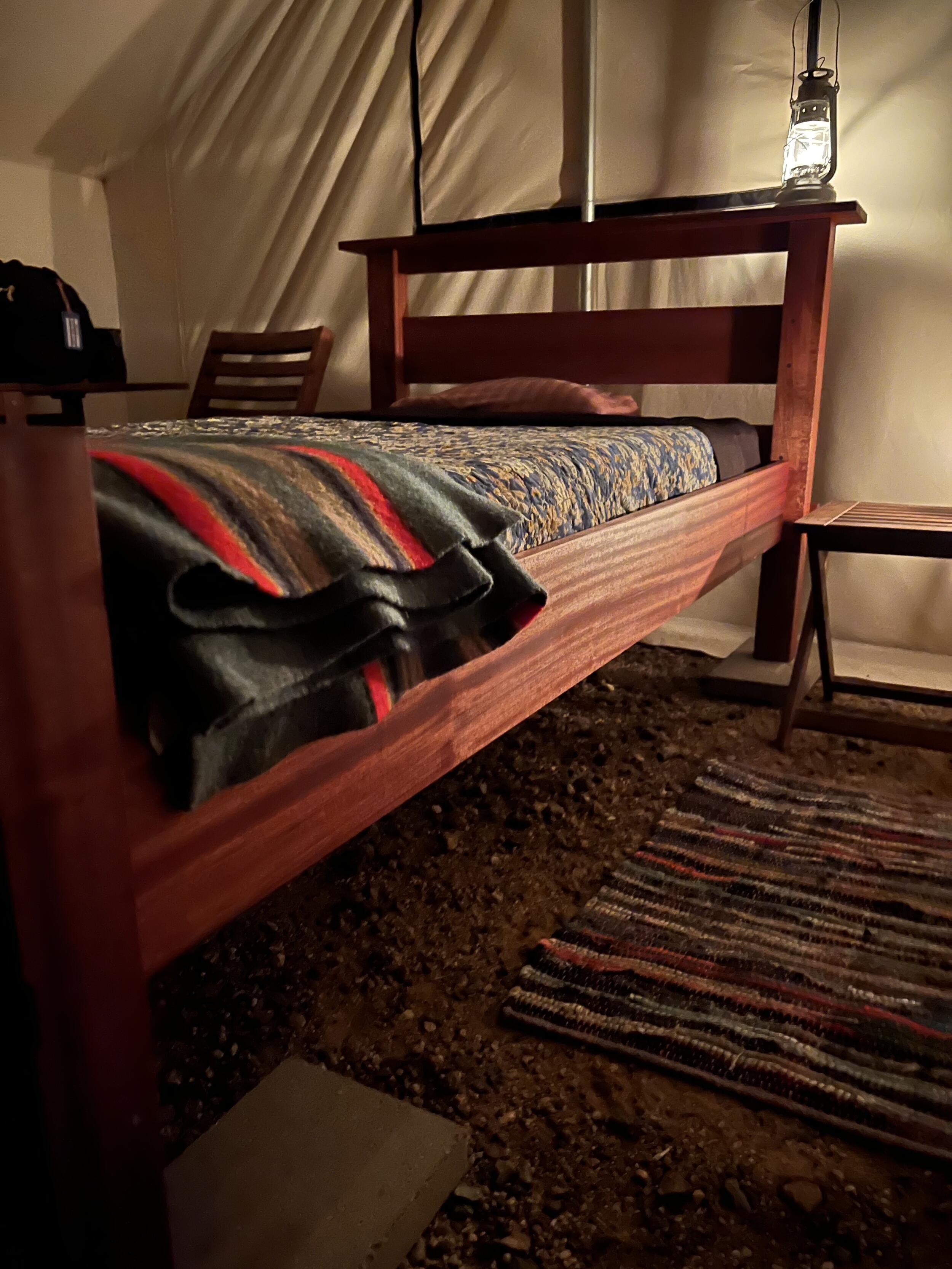 frame is all Sapele, wedges/tusks Ipe, slats under mattress poplar. 4 wedges hold it all together. Works well in the tent or the guest room.