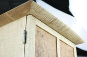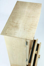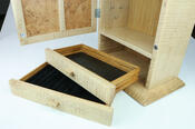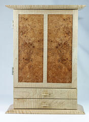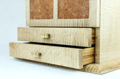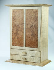 Because my daughter has a lot of necklaces, she wanted a tall cabinet to hang them. I included two drawers for the rings and earrings, too. You need extra curly maple in order to arrange the grain or plan the cuts to use the figure in exactly the project parts you want, but I think it's worth the effort. Didn't have a large enough piece of veneer to make the door with one panel, so had to do it in two panels with a stile in the center.