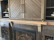 This project was built into a 2'x10' "bump out" in the great room. The doors above the fireplace are on rollers, so they just cover the bookcase openings when the TV is visible. I built (rather than purchased) the shutters to insure that the stain matched the center console. Decorative fencing was used to give the unit a different look
