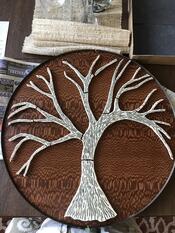 Leopard wood veneer is laminated to mdf substrate. Tree is made of engraved ceramic intentionally broken to create a look. Because tree parts were not flat, each piece had to be elevated with a spacer; this also adds depth. Edge is made of walnut, two solid single pieces, bent (not steamed first) and glued to the edge. Note 1/8" brass piece in top and bottom of edge to facilitate completing the loop.
