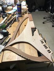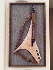 This project is designed as a tribute to music, representing a piano, a harp and a guitar all in one instrument (that does not play). The most challenging part for me was dealing with curved and shaped woods. It drove me to be more precise and to use more hand tools to get the desired effect. Note the damped sine wave which is made up of different diameter brass inlays. The left and bottom arms also have a brass, ebony and maple inlay on the edges of them.
