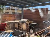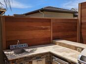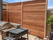 Custom built 9' tall privacy fence with accent wall on backyard patio. 220 bd ft rough lumber milled down to 125 bd ft of boards. Mounted to wall using 3" square metal tubing with redwood attached to wall and buried 24" deep into concrete footings. Took me a total of 3 hours and 2 trips to different locations to get it all, but customer was blown away, and now they have a one of a kind exotic wood fence that will last for years to come.