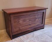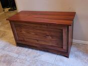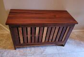 Entry bench for shoe storage. The Goncalo Alves top makes adds impact to the design. Pivot hinges with spring loaded magnetic catches allow the door to pop open and shut. A slatted back encourages ventilation.