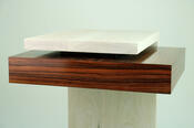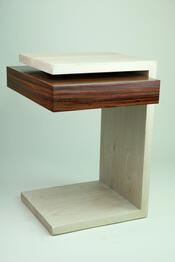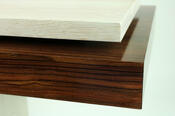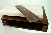 Jim bleached the white oak to amplify its crisp 90-degree design, and "hung" a highly contrasting morado shelf-compartment-thingy seemingly (and flawlessly) floating under the table top.
