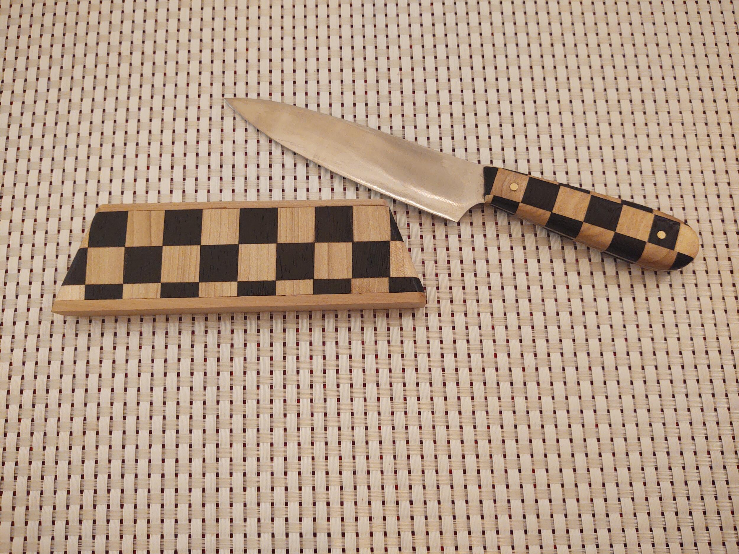 11.5" chef prep knife. 5" handle. Made with ebony and maple squares to make up the checker board pattern. The sheath sits on the counter to hold/display the knife.