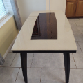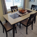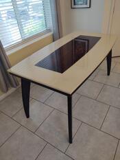 Dinette set, 30" x 60" boat shaped. MDF base with 1/4" wenge inlayed into center with matching boat shape. Faux stone finish around wenge inlay with 2 coats of epoxy...1 seal coat and 1 flood coat. Apron and legs are 1 1/1" pine...tapered/curved from 5" at the top down to 1 1/2". Chairs were purchased.