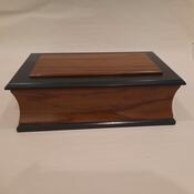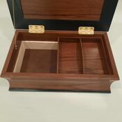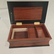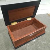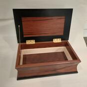 This box measures 7.5" x 12.5", 4" tall. The sides and top are Red Marblewood, the black frame and trim are ebonized Cherry and the lining is Basswood. The bottom is lined with leather.