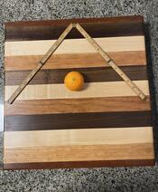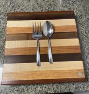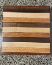 I used leopardwood on the outside as a decorative touch. Without the availability of an electric planer, I used pins to align the top edge. This reduced need for a lot of hand planing. The surface was sanded and buffed to 3000 grit. Used a generous amount of Mahoney’s carnauba wax and walnut oil finish. Allowed it to dry for an hour and buffed out. The end result is 18x17x1.75” on wooden feet with rubber pads. This project took 4 days.
