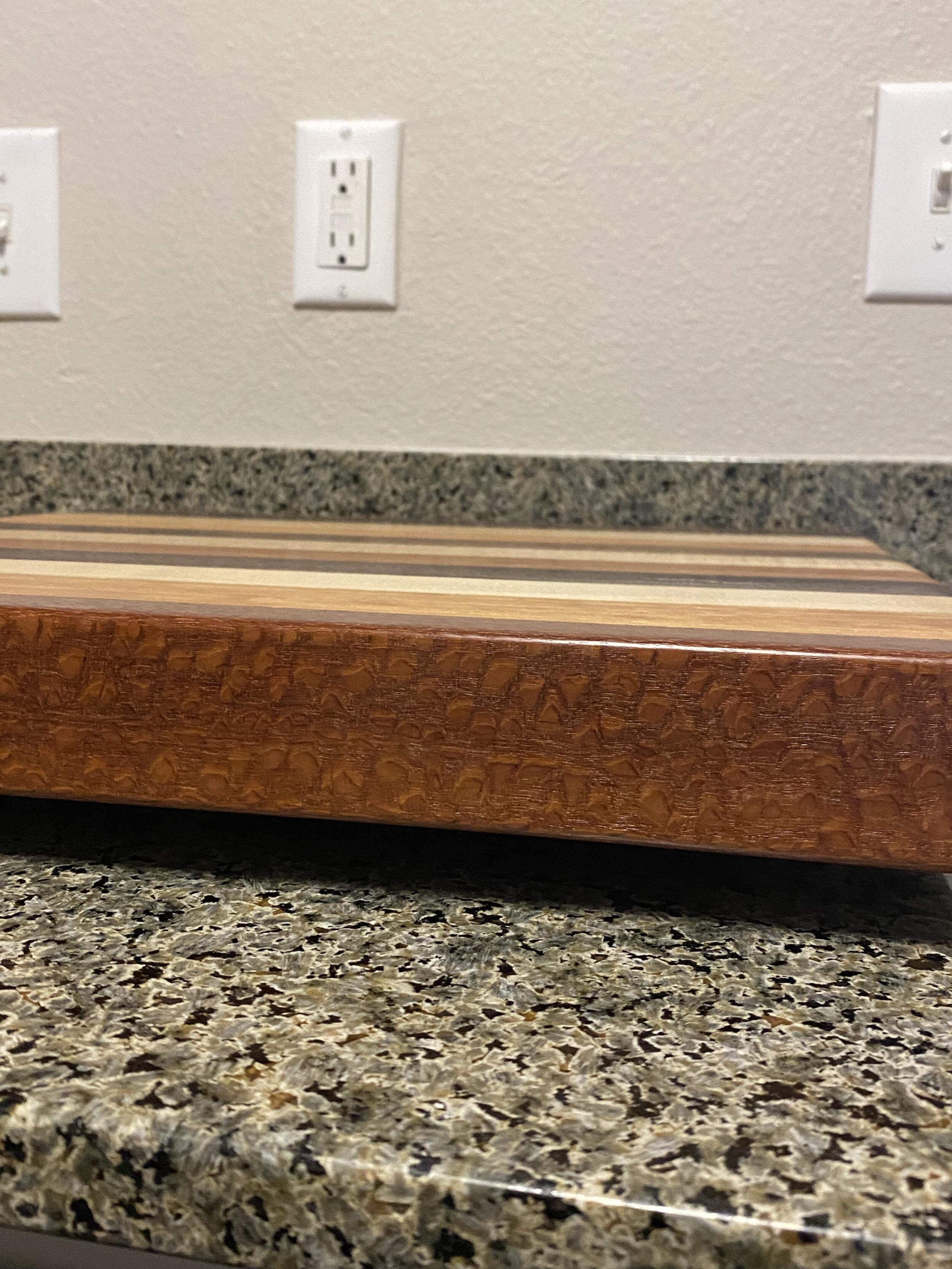 I used leopardwood on the outside as a decorative touch. Without the availability of an electric planer, I used pins to align the top edge. This reduced need for a lot of hand planing. The surface was sanded and buffed to 3000 grit. Used a generous amount of Mahoney’s carnauba wax and walnut oil finish. Allowed it to dry for an hour and buffed out. The end result is 18x17x1.75” on wooden feet with rubber pads. This project took 4 days.