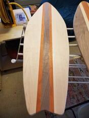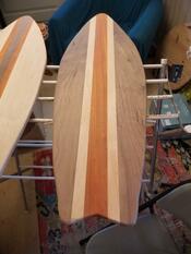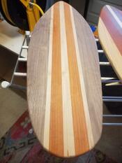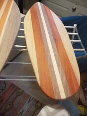 Glue-ups of various ripped boards to make charcuterie boards shaped like small surfboards (we live at the beach). Made of hard woods so can also be used as cutting boards