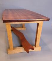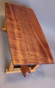 Coffee Table with a figured Sapele Mahogany top on Cherry legs tied together with a Jatoba snake accent piece. Bridle joints on the top and mortise and tenon on the bottom. The snake is grooved onto the the legs.