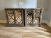 Knotty alder cabinets with arabesque design in the mirrored doors. The first door was cut with a scroll saw and hand sanded. The second one was routed with my CNC — much nicer and easier.