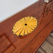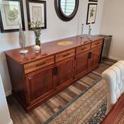 Cabinet with two double door storage with fixed shelf and four drawers across top. Doors are arched raised panels with panels made from solid Jatoba. Carcass is completely solid Jatoba panels top, bottom, and sides. Top is a subpanel of Poplar joined to sides with dovetails and bottom panel is Jatoba also joined to sides with dovetails. Top is solid Jatoba panel inlaid with commercial border and self-made Federal Oval Fan from dyed Sycamore. Drawer fronts are joined with half-blind dovetails overlaid with a beaded border.