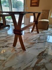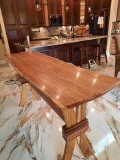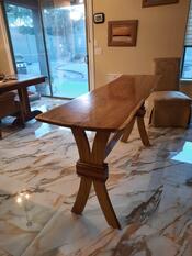 5/4 Live Edge Canarywood slab, with curved 5/4 Canarywood legs and stretcher, accented with Caribbean Rosewood (Chechem) "wrap-arounds" at the legs' waists and attachment plates.