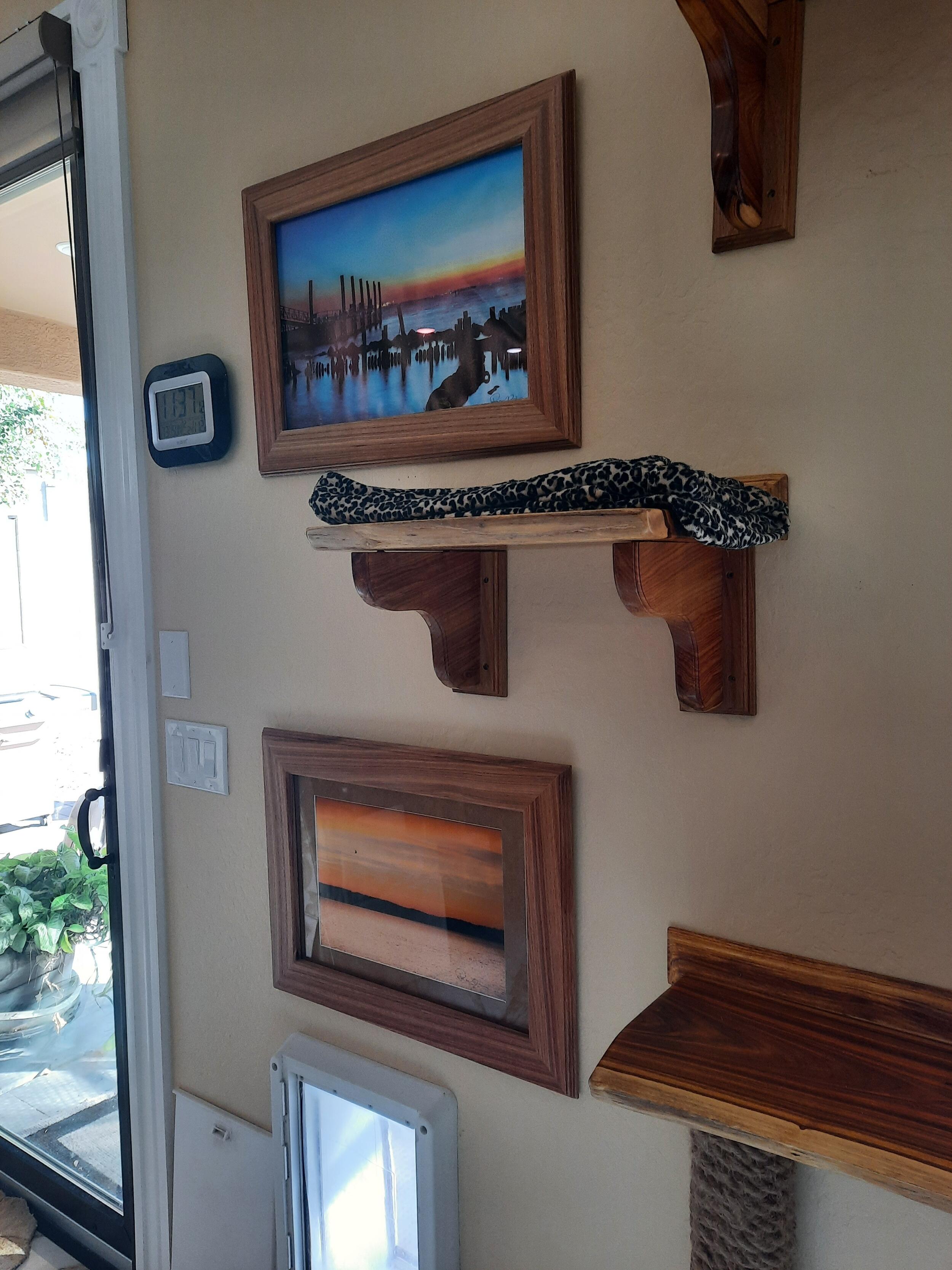 1 Scratch pole with Hemp Rope and Canarywood trim; live edge Canarywood platforms with corbels; Chechen and Canarywood bed with Corbels.