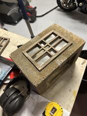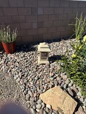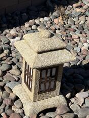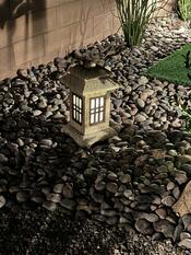 Granite Japanese lantern brought back from my active duty time in Japan. Granite was bead blasted, Roasted Poplar used to recreate the grid backed by opaque lexan, low voltage landscape light.
