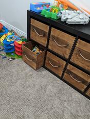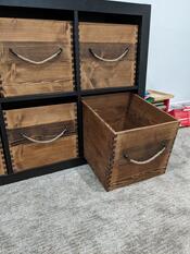 A great place for 5 little boys to put their toys. Strong enough for when thy throw their cars and action figures into them. The 1/2 inch sides are connected with dovetails, and the bottoms are 1/4 inch panels which are slid and glued into dados.