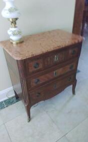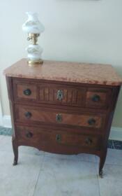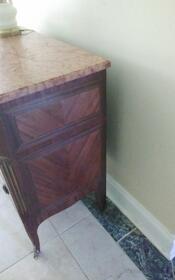 I did not build this chest, just restored it, and only a small part of the wood was replaced, so nothing fancy was done, but I am proud of how beautiful it turned out to be. This was a painted cabinet found at an antique/flea market. Even the marble top had been painted. After gently stripping off all the paint with alcohol and old tee shirts, a lovely marquetry chest was discovered. It had some damage that I just covered up with stain, but the front facing where the drawers slide in and the curvy bottom piece were destroyed. I removed the remaining veneer and scraped away the wood filler. Then I had to enlist my hubby. Neither of us have done this kind of work but he was able to use hand tools to cut, glue, clamp and sand your gorgeous mahoghany veneer to replace all the old veneer. I then stained it with a rosewood stain. The veneer and stain were an almost perfect match and now the piece gets to live as it was intended to live.