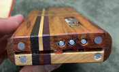 Darts Case that holds three darts with flights attached in linear set-up. Storage for extra flights and shafts, magnetic closures on both ends. Woods not listed are Redbud and Pecan.