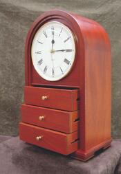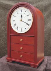 Solid mahogany mantle clock. Rounded top constructed with four staves, then bandsawed to shape. Three small drawers and digital clock movement, friction fit.