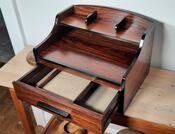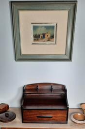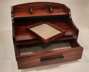 A gentleman's valet or jewelery box. A place to store wallet, keys, change or other pocket items. The drawer includes a sliding tray, both the drawer and tray are lined with brazilian leather.