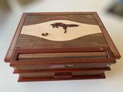 This box was created for the Americana Theme Contest. All of the elements (fox chasing the squirrel, weathered American flag, internal box lids, etc.) were designed to reflect that theme. The fox, squirrel and flag are not just attached to the box; they are inlayed, giving me some opportunity to practice with precision inlays utilizing a laser. The metal inserts are actual 38 caliber shells, used to reinforce the Old West Theme of the lower drawer.