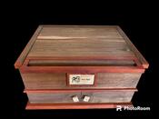 The box features a woven wood top (the design goes all the way through), a special wrap around handle design and a completely concealed hinge made up of a brass rod riding inside a brass tube.