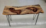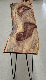 Back in her garage workshop, she spent hours coaxing the shape to life. She kept the live edge raw and honest, sanded the surface until it glowed, and chose hairpin legs in matte black—just enough to lift the piece without stealing its voice.