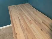 Beautifully crafted built-in for an office that is made up of a hickory/ash butcher block table top and floating shelves which a sliding door cabinet system flanking the right side of the room