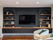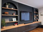 Just wanted to share this project I finished for our living room. The counter top and natural wood trim is red oak that I planed down. Wood finish is Natura One Coat. Bottom cabinets are IKEA. Slat wall is primed trim. Arched shelves is poplar. I didn't want to remove my ceiling trim so I made the arched shelves have tapered look. Hope you like it!