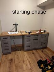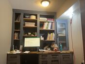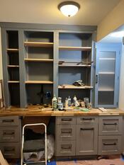 Finish: paint and primer in one and general finishes high performance top coat for shelf’s and sawtooth shelving system