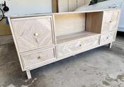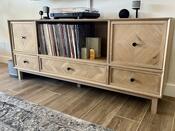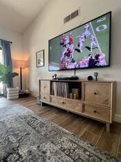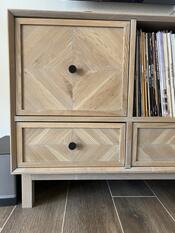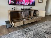 TV Media console with lots of storage. Built with three bottom drawers, two upper cabinets, and a wide middle section for vinyl albums. Back of the unit has a false back to hide the dozens of plugs, cords, and hidden devices and keep everything tucked away as best as possible.