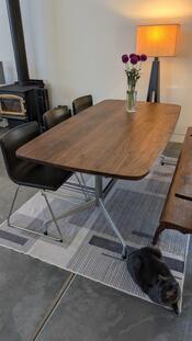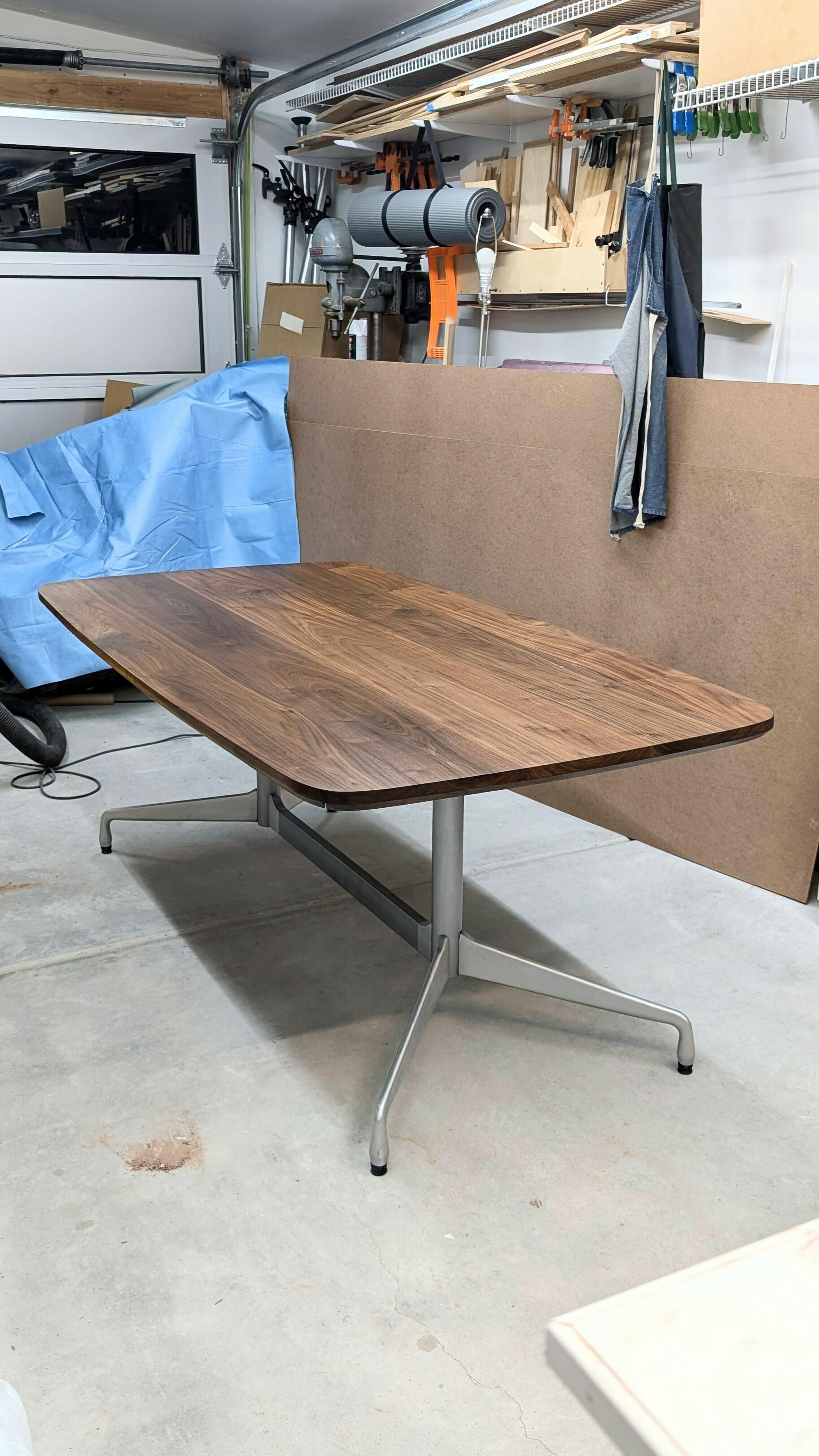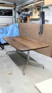 This is an update on a Eames Aluminum Group base by Herman Miller that I picked up on Craigslist. The original tops were usually Formica laminates in a rectangle or racetrack shape and the bases were finished with black enamel on the steel sections. I stripped off the black enamel and finished all the metal in a satin finish and then built the top from walnut boards that I sourced from WS - the staff matched these boards and they came out beautifully consistent in figure and color.