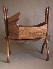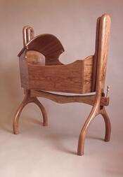 Cradle frame knocks down for easier transport/storage. Turned pin in tenon inserts into a hole to keep cradle from rocking. Arched top is not glued to (cross-grain) headboard; rather there is a small space between them to allow for movement.