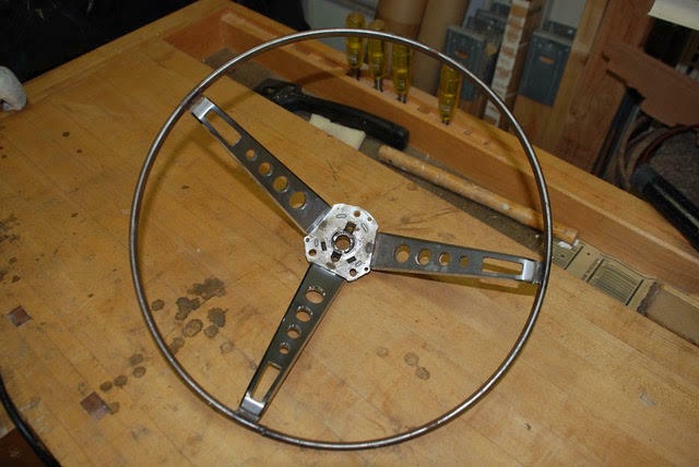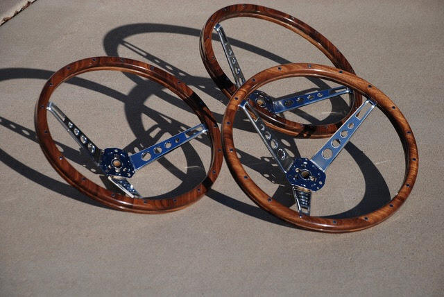 Here are a few photos of the build process for these steering wheels. Basically, I build a hexagon using splines for the top and bottom pieces of the wheel. First a circular groove is cut into the top and bottom hexagons with a plunge router using a circle cutting jig. These grooves will eventually allow the rings to be glued to the steering wheel core. Shoulders are cut into the bottom ring for stainless steel rings that are part of the original steering wheel which were plastic fake walnut. The rings are then cut out of these hexagons with a plunge router using a circle cutting jig. The SS rings give the illusion that the top and bottom rings are sandwiched on a solid steel core when in reality they are sandwiched around a band welded to the spokes of the wheel. This is the structure of the original steering wheel.