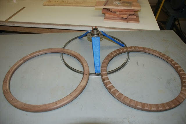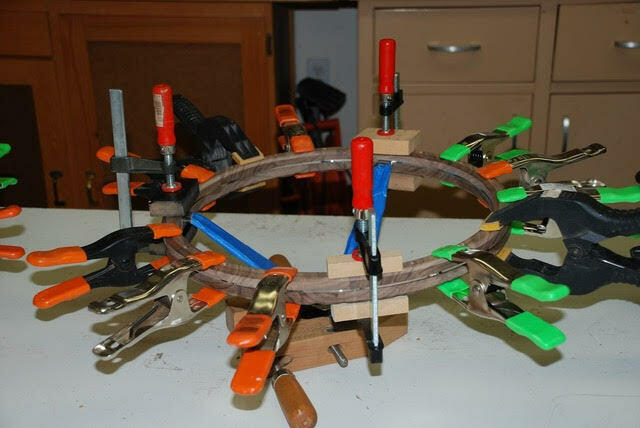 Finger holds are cut into the bottom ring with a router and jig. Relief cuts are also made to accommodate the spokes of the wheel. A series of countersunk holes are drilled into the top ring to accomodate polished stainless steel rivets. These rivets are for show only and are not mechanical fasteners. Both rings are rounded over on a router table. The bottom ring is glued onto the original steering wheel band with HD construction adhesive. The top ring is attached with more construction adhesive and TiteBond III glue where there is wood to wood connection. Then lots of sanding up to 220. I finish with 2-3 coats of Danish oil followed by 5 coats of wipe-on semi-gloss polyurethane.