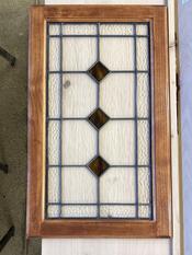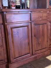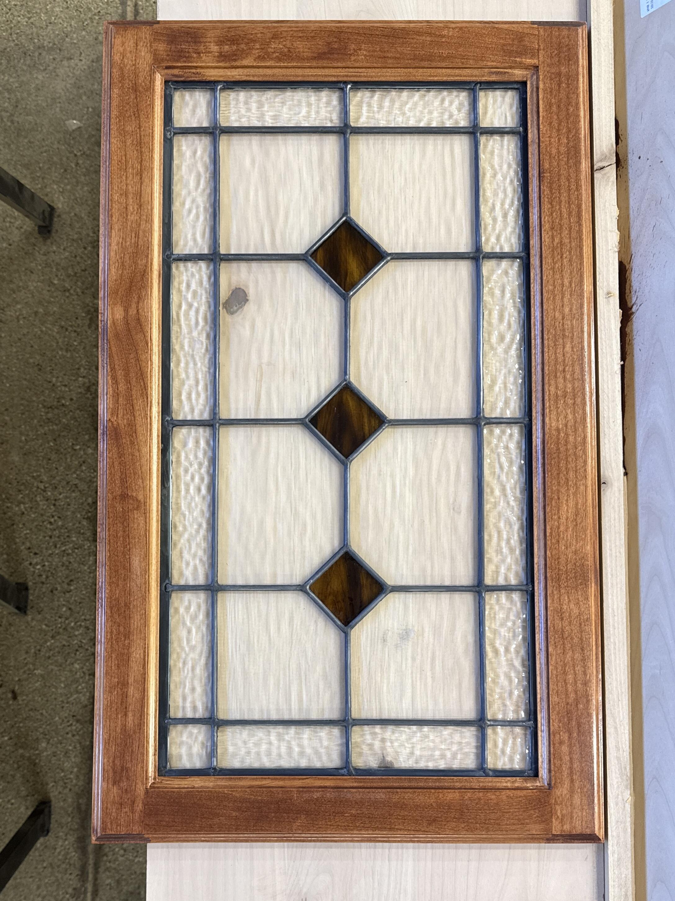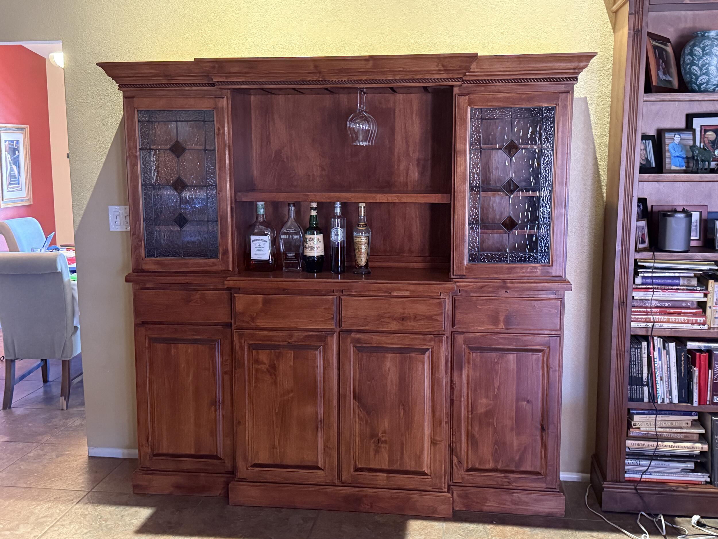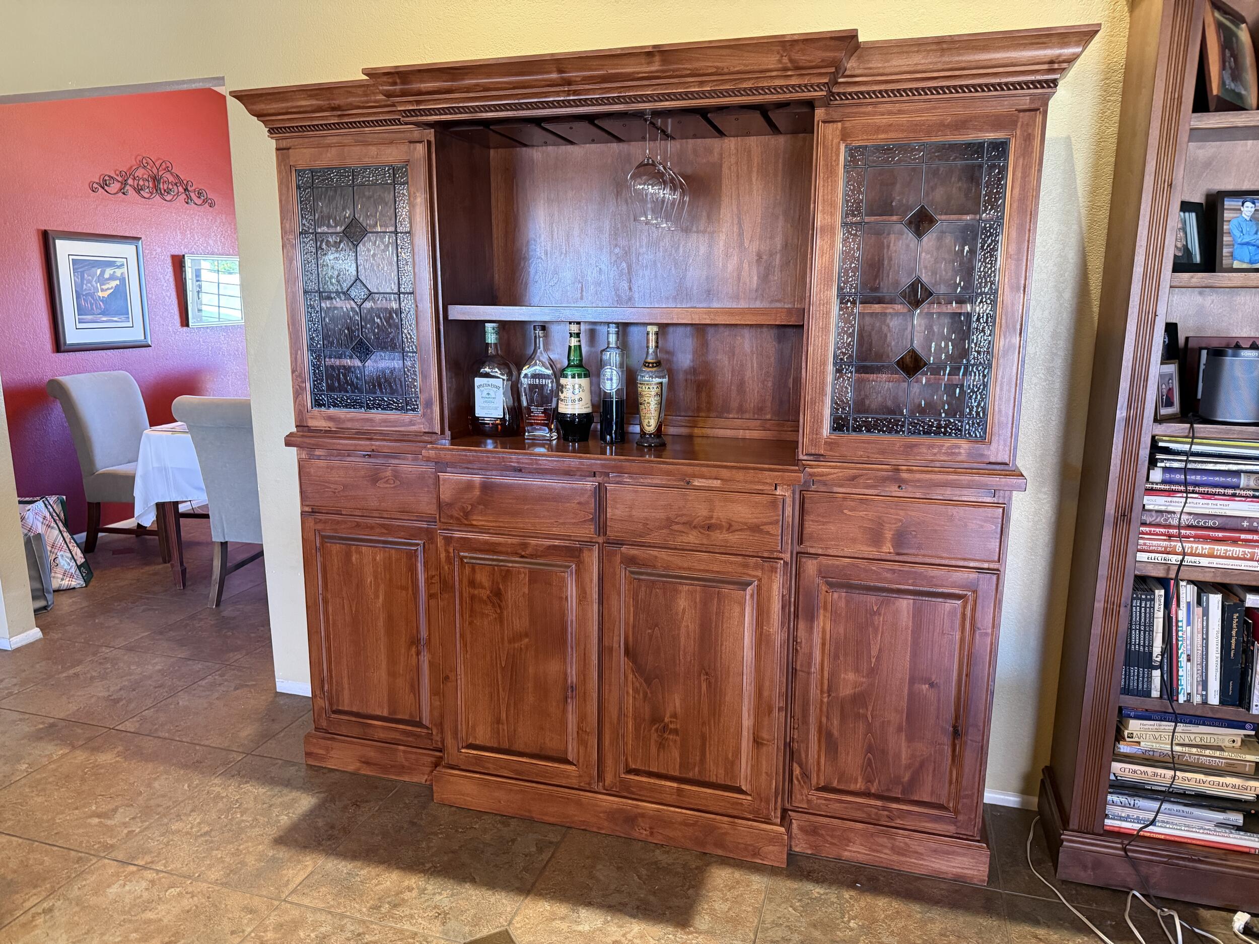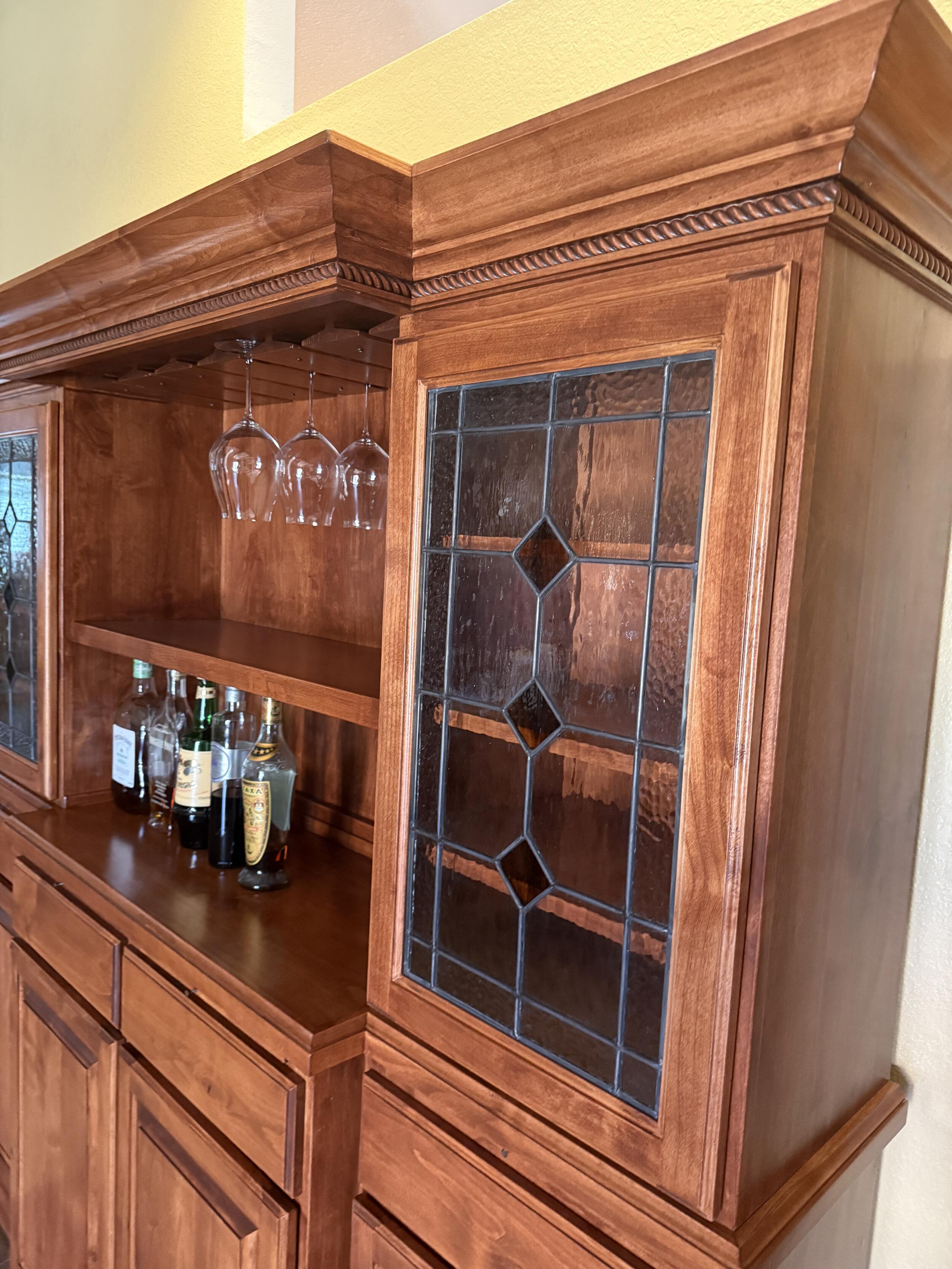 Custom cabinet designed in Sketchup. Raised panel doors on the bottom and custom stained glass panels on top. Crown molding with added rope molding accents the top. Wine glass rack designed to fit larger Pinot glasses as well as standard wine glasses. Adjustable shelves with holes carved with CNC. Four pull out shelves add counter space. (Pulls and knobs added after pictures taken)