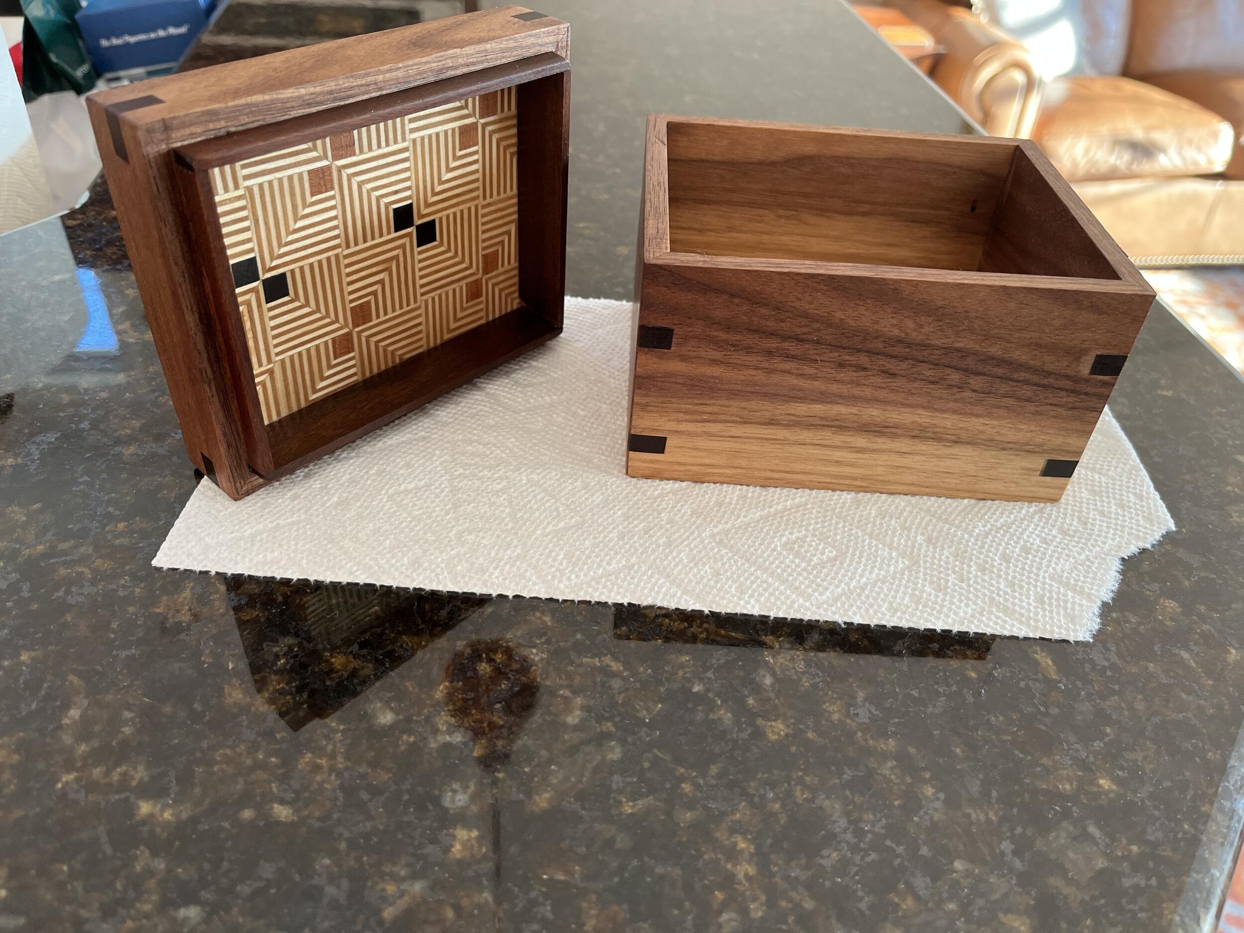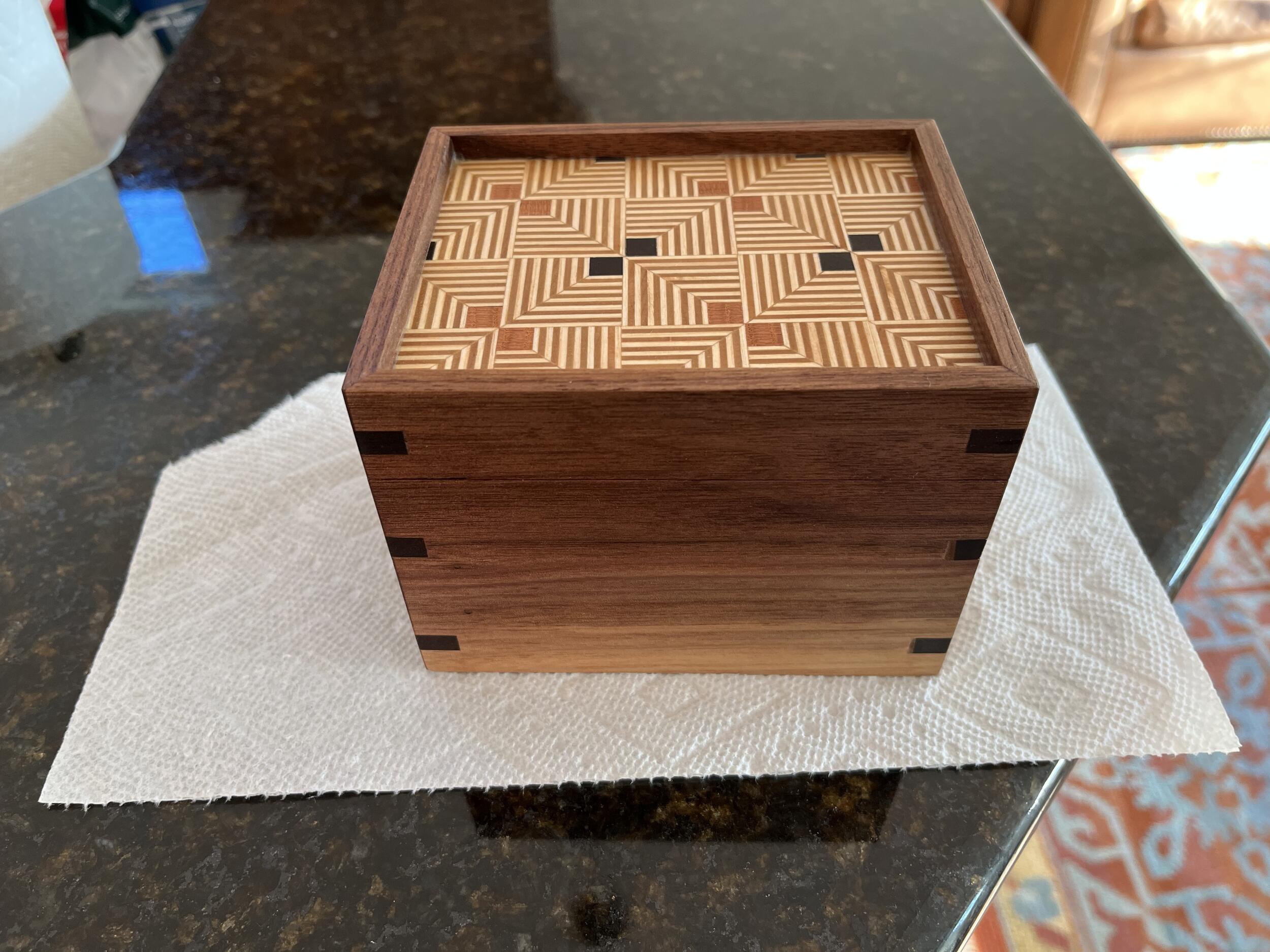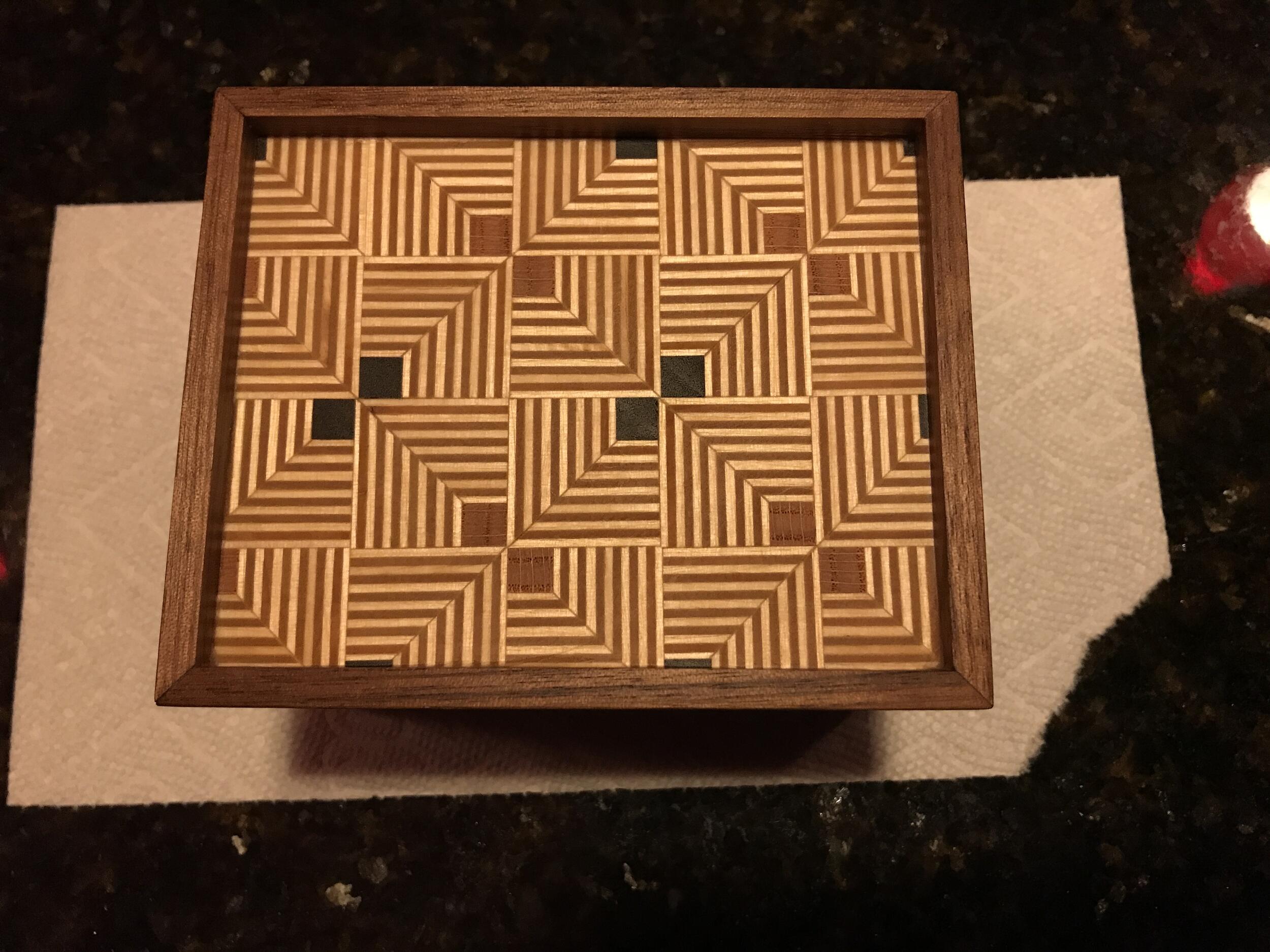 Small Walnut Box for my wife. Patterned Plywood top and bottom (Inspired by Michael Alm)