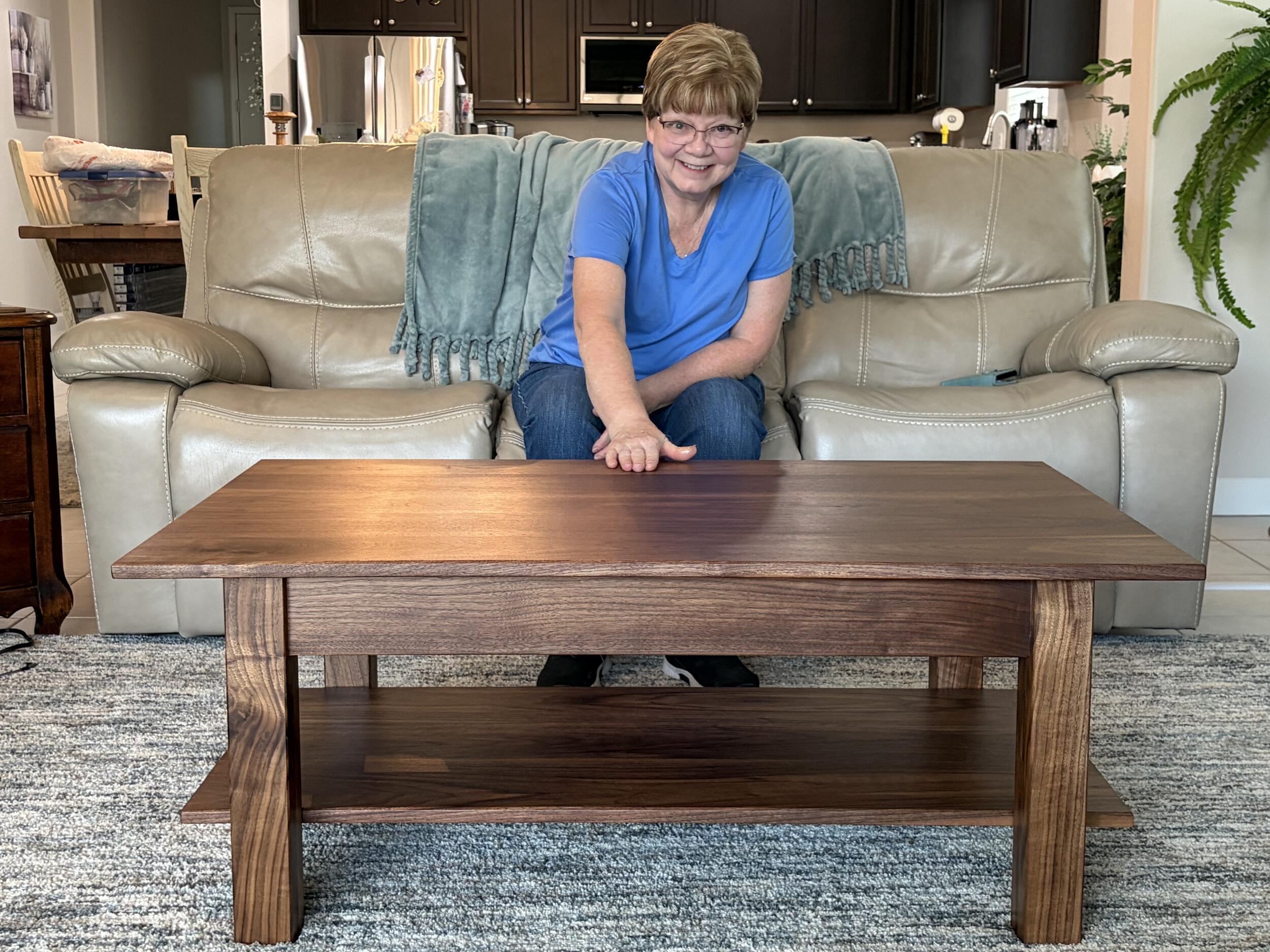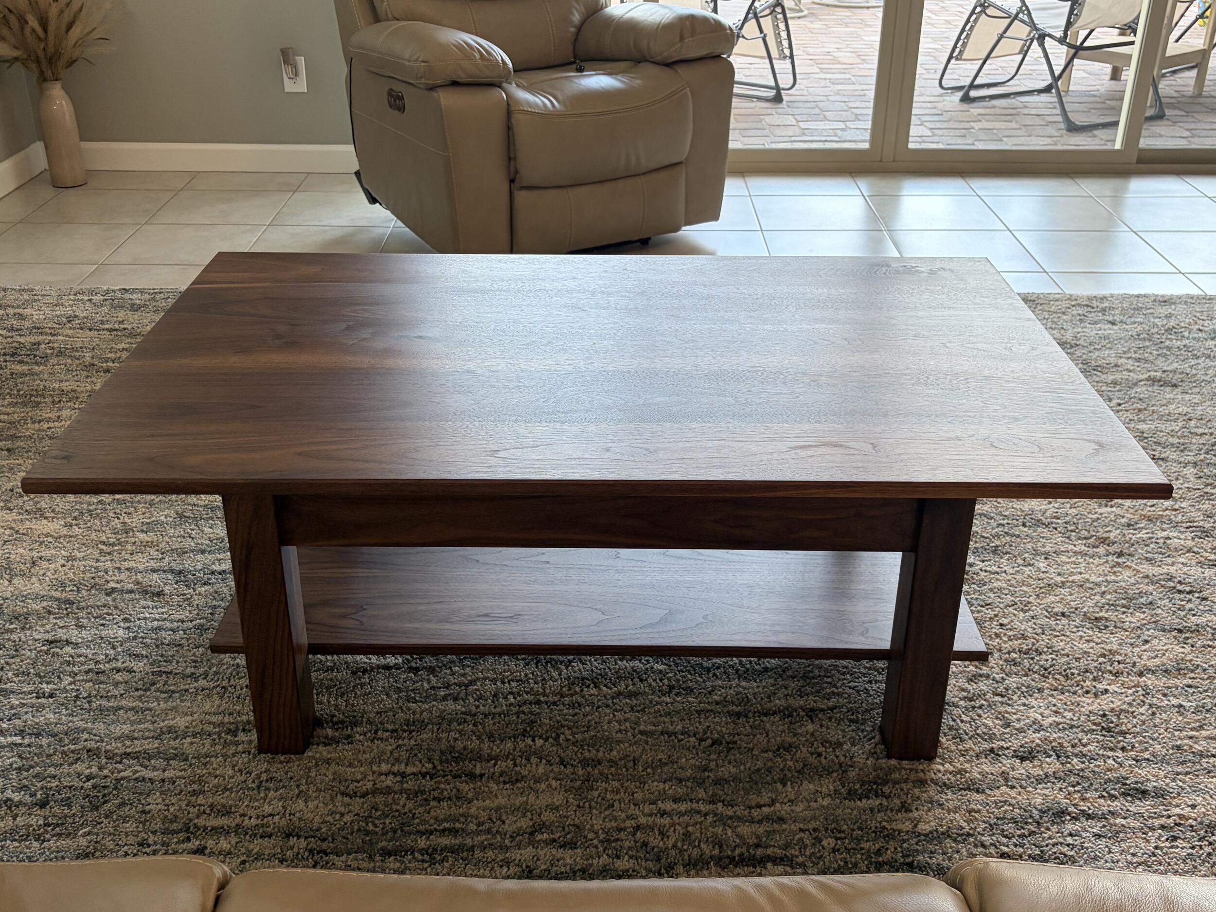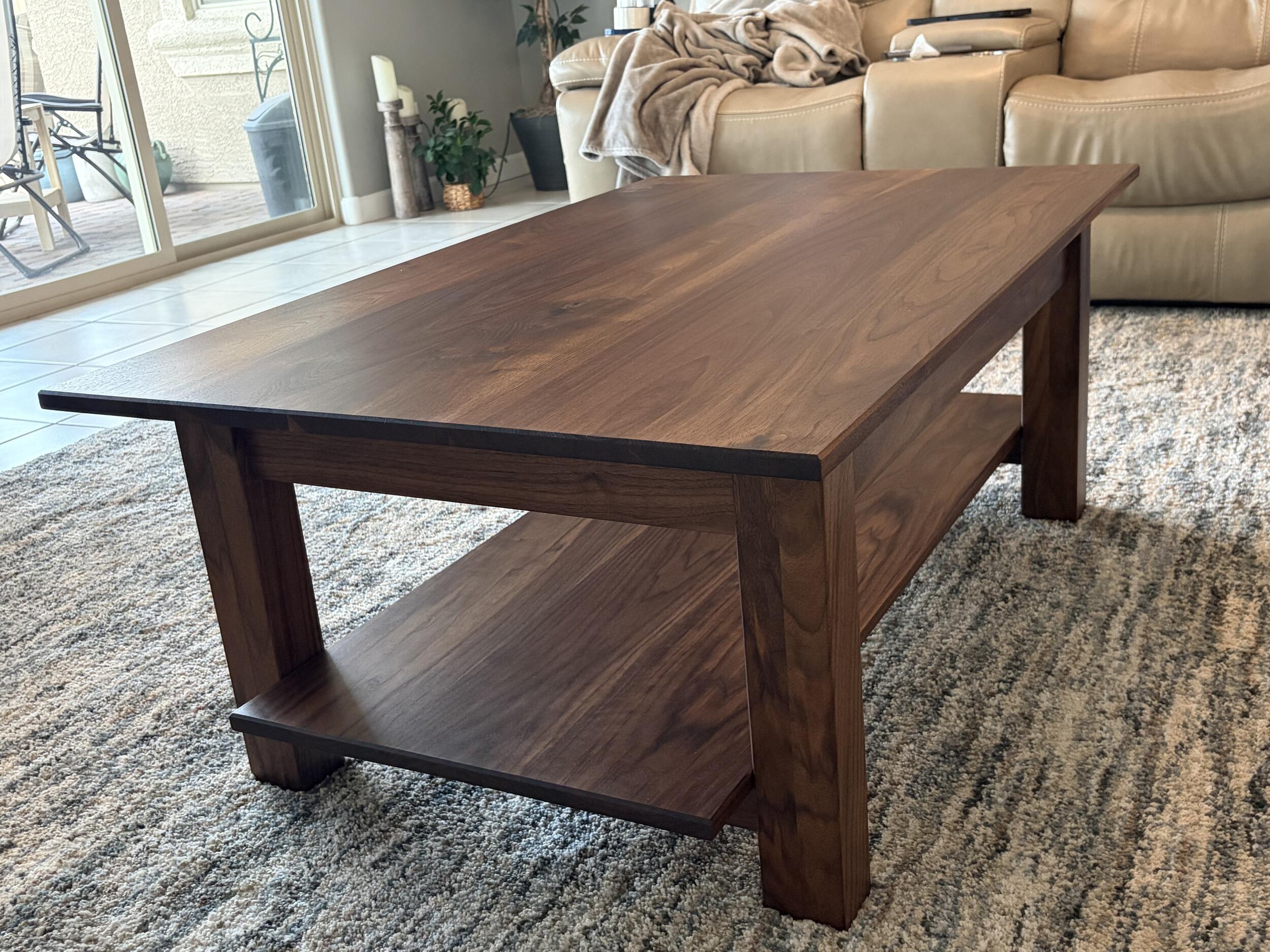 30”x48”x 16” Solid black walnut lift top coffee table w/storage and faux brown leather liner& open second shelf.