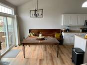 The kids wanted a table to seat a large crowd and fit in their new space.Having a nice big open wall made the decision for a bench pretty easy and let us maximize the table size.Went with a 60x68 inch table and a 3 person bench with an extra seat on the 8 foot bench.Size and weight of it all was probably biggest challenge once I had to move indoors once winter came.