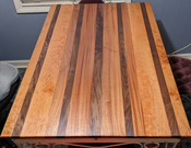This is a table top my son and I made for his mom after her glass table top broke. It's made with Sapele, Cherry, and Walnut. The pattern is meant to be a wood version of a palindrome, so that the wood and width of each piece is the same if you start at the center and work out to the edge. The widths are 1.5 inches, 2 inches, and 4 inches. -- Orginally posted by Motoyogi