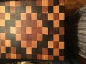 After the glue has dried and been cleaned off the cutting board you can apply extras such as rounded edges, hand holds or drill for rubber feet then sand smooth. After you've completed your cutting board it can be finished with Mineral Oil or other food safe finishes. -- Orginally posted by lalady61