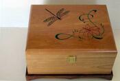 A small cherry box with a decorative designed top.Size is approx 8 x 9 x 4.A tray and dividers are part of the box with the bottom of the tray and thebox being felt lined.The dark trim is cherry stained with mahogany stain -- Orginally posted by Dgreen449