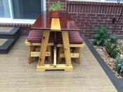 I made this for my wife. We live in a condo and have a small deck so I built this table most of my outdoor furniture is red cedar but the table top is Sapele with a red oak ribbon in the center of the table, the kegs and stools are red cedar. -- Orginally posted by Flubadub