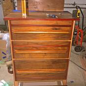 Chest of Drawers, Black Walnut, Bloodwood Canarywood- Drawer pulls lamanated Canarywood Blackwalnut top bottom milled out 3/4 deep ,3/4 wide for grip ,Face Roman Ogee edgeing , Center made from Bloodwood w/ 3/16 flutes 1/4 proud of face, slides for drawers made from Hard Maple exstending 4 past rear of drawer 3/4 x 1/2 x 26 long, carcass sides from 3/8 Baltic Birch. When cutting Bloodwood I made sure it had sit in my shop for 9 months to relieve inturnal stresses, cut 1/8 large planed 1/16 all sides let it sit 2 days after milling - Bloodwood has lots of inturnal stresses. Finshed w/ hand rubbed oil, seal coat shallac, top coat w/ Helmsmans Oil Based Polyurthane, sanded parts w/ 120 grit before assembly,180 aafter 1st seal coat, 220 after2nd seal coat -- Orginally posted by wyowoodsmith