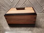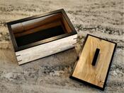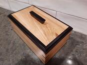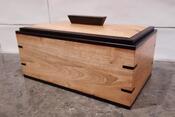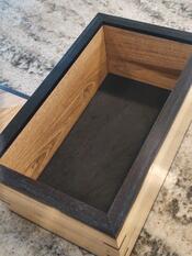 I made this for my granddaughter's 18th birthday. The Yellow Oleander, Cascabela thevetia, came from a landscape tree we cut down about 10 years ago. A piece of the trunk was sealed and sat in my workshop, all these years, waiting for a project. Finally, I sawed it into lumber. The box was sized to use the available material. The Madagascar Rosewood, Dalbergia maritima, came from strips I acquired many years ago. The box measures 9" x 5", 4" tall, walls are 1/2" thick, has mitered corners with splines, the top is beveled. The interior bottom is lined with black leather. Finish is clear lacquer. The natural rosewood was a gorgeous deep burgundy color, it turned black with the lacquer. Surprise!