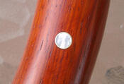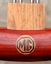 This wheel was built out of two hexagons of paduak wood and routed into a circle. At every 'hour' is Australian mother of pearl set in brass, and at 10, 2 and 6 are 'rosettes' of an MG logo built of contrasting wooden strips. Similar to intaglia or marquetry, except that I built this logo using 40+ strips of wood which I assembled into a nine inch long log which I then turned on a lathe. I could then simply cut quarter inch plugs from it and insert these into the wheel. The fillets which encase the spoke ends at 10, 2 and 4 are made from Honduras rosewood. -- Originally posted by gbakertucson