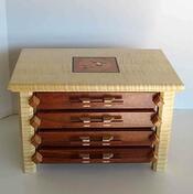 Jewelry box made from Curly maple (from the USA) and Macacauba (from S. America). The inlay I bought (I am not that talented to do a humming bird) and then I inlay-ed it into the wood with the black trim. The finish is a boiled linseed oil and satin lacquer and the drawers are lined in felt. The drawer pulls are hand made Top two drawers have wooden dividers. The size is 14” long, 9” high and 12" deep (measured the top)