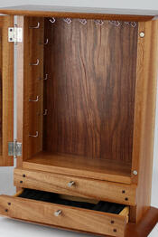 We came up with an idea for a cabinet that would hang on the wall with a French cleat, and have a lot of space to hang necklaces as well as a couple drawers for rings and stuff.